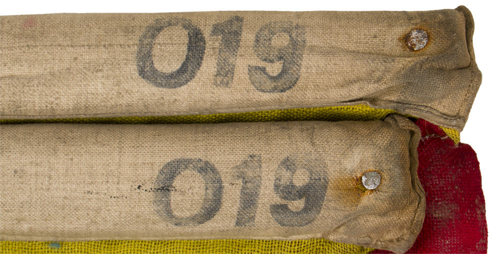 A pair of square, coarse linen signal flags that is divided diagonally with red at fly and yellow at hoist. They are suspended by 38cm long wooden dowels. There is some fraying to each. Unable to determine which exact country they are from as they are used internationally.