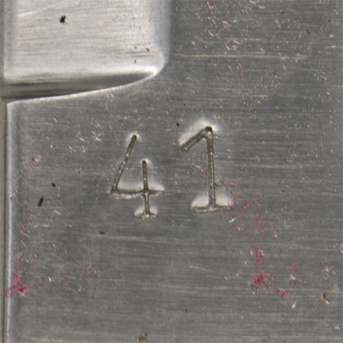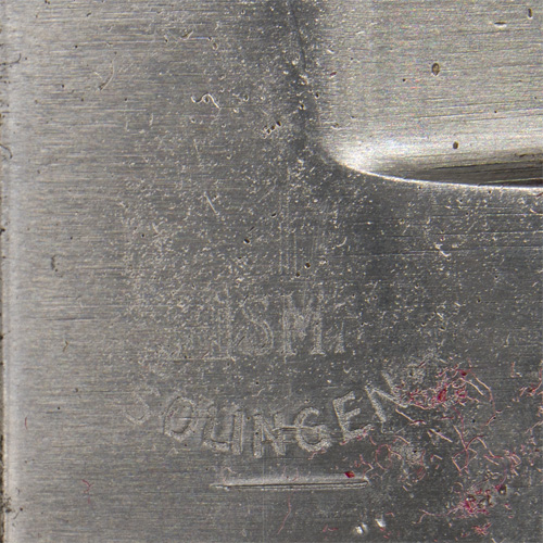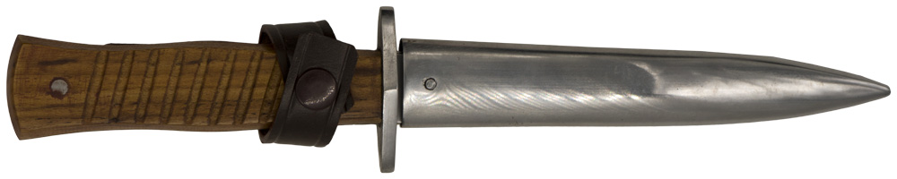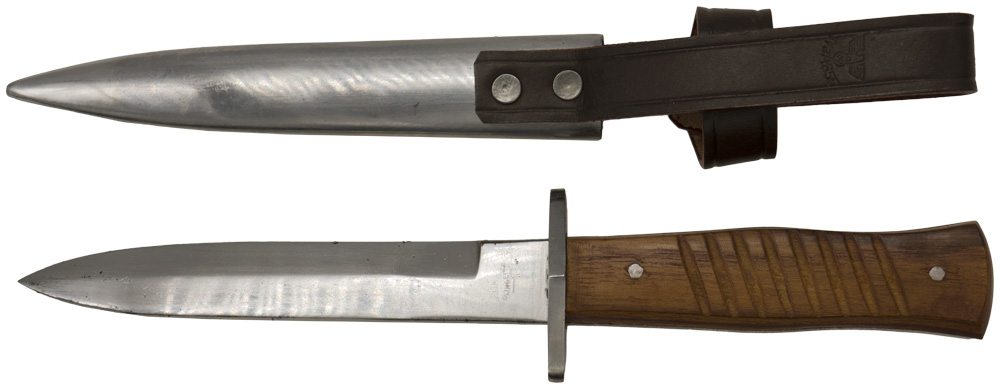 The replica knife features a roughly, 14cm long, non-fullered, blade with a long top swedge. The blade is "Soligen" and "41" marked. The knife has a small, integral, horizontally oval, steel cross guard and nicely contoured, carved, natural softwood grips. The grip are secured to the blade tang by two small, flat headed, steel rivets. The knife comes complete with a unpainted sheet metal scabbard with integral leather frog that has a "Waffen amt" stamped to it. The blade has been oiled.