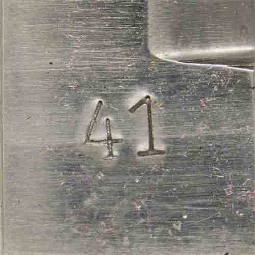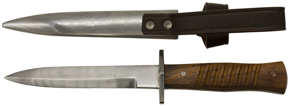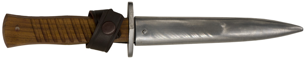 The replica knife features a roughly, 14cm long, non-fullered, blade with a long top swedge. The blade is "Soligen" and "41" marked. The knife has a small, integral, horizontally oval, steel cross guard and nicely contoured, carved, natural softwood grips. The grip are secured to the blade tang by two small, flat headed, steel rivets. The knife comes complete with a unpainted sheet metal scabbard with integral leather frog that has a "Waffen amt" stamped to it. The blade has been oiled.