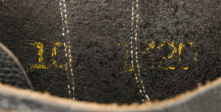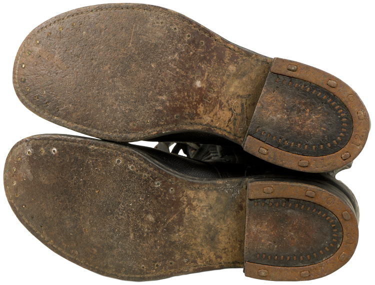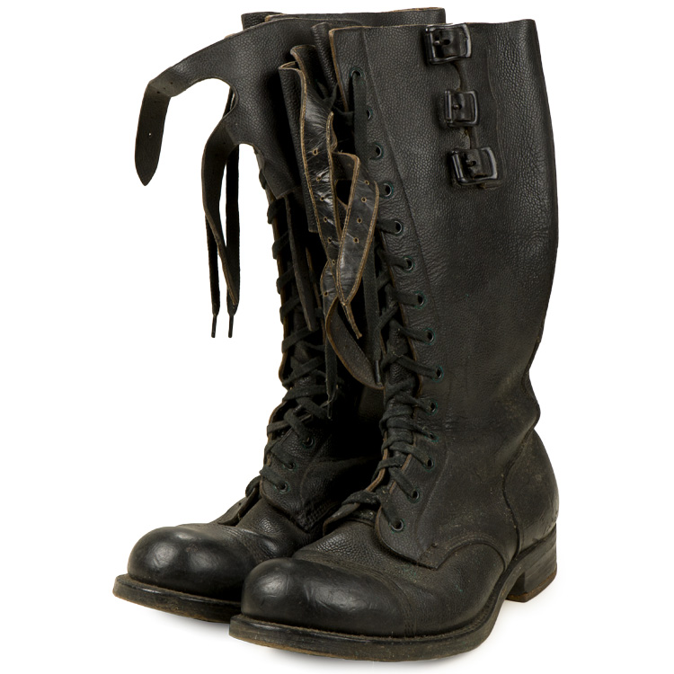 A pair of black leather boots constructed from pebble-grained leather with a 34cm long boot shaft, fourteen pair of metal grommet and a triple buckle built in "gaiter." Heel plates are intact, but the toe plates have been removed. There appears to be a size marking of "10" to the interior of each boot. Laces included.