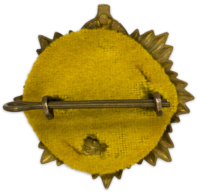 : Every infantry or armored regiment had its own insignia. Cap badges were usually made of white metal, brass, copper or bi-metal. Most commonly brass and white metal were used. Officers were sometimes known to wear private purchase cap badges made of silver or silver bullion.PHYSICAL DESCRIPTION: A 4.5cm diameter stamped brass cap badge which features a King’s crown surmounting a stylized belt with "Honi Soit Qui Mal Y Pense" (Evil To Him That Evil Thinks) embossed upon it, the belt encircling the monogram "GR VI," with a wreath of Maple leaves to either side of the crown at the top and a scroll below inscribed with "Royal Canadian Army Service Corps" all overlaid on an eight-pointed, radiating star, with its top point obscured by the King’s crown. The reverse is a mirror image of the obverse which has double prongs and a cotter retaining pin that sits on a yellow wool backing.