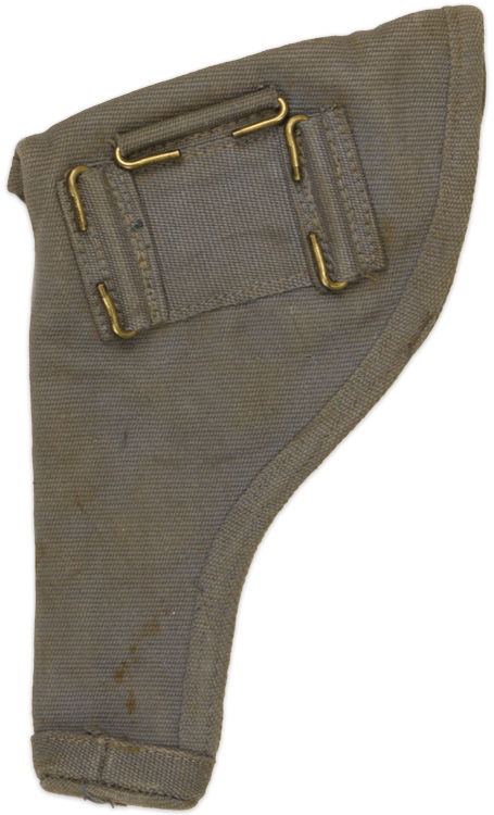 A standard RCAF issue blue-grey web holster for pistol or revolver with brass fittings. The canvas holster is about 30cm tall and 18cm wide along its top, tapering to 6cm at its reinforced base. It has a fold over top flap with brass snap closure. The edges are reinforced with additional stitched on webbing. There is a metal drainage grommet to bottom. Sewn to the reverse is a piece of webbing about 10.5cm by 7cm folded over on three sides to create loops through which three brass belt hooks have been inserted. Stamped in black ink to the interior top flap is faint makers mark and "C broad arrow", indicating it was issued through the Canadian Quartermasters Office. The holster shows typical usage, wear and staining.