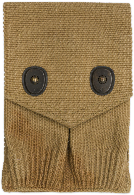 This pouch was designed to carry the magazines for the M1911 Colt pistol. It is divided into two vertical stacked pockets each with the posts for the "lift the dot" snaps attached. Each pocket is approximately 15cm in length by 5cm in width. There is a snap to the reverse on the belt loop that allows the pouch to be fitted to the pistol or mounted belts. Stamped to the inside flap "Oct. 1918" as well as being "Mills" marked.