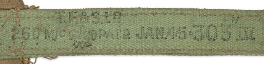 A cloth belt that is marked and dated for "JAN. 45" and ".303 IV".
