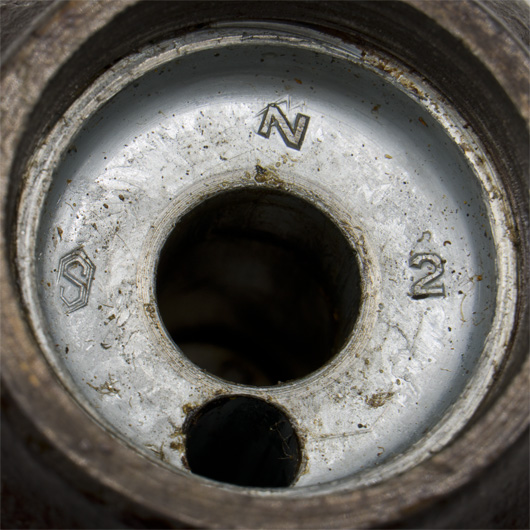 PHYSICAL DESCRIPTION: The egg shaped grenade, roughly 10cm tall and with a circumference of 19cm at its widest point, is of serrated cast iron with a detachable striker lever, fixed in place by a horizontal pin. The grenade was lacquered and has the remnants of a band of red X’s which were the Commonwealth markings for a grenade that was filled and sealed for use in tropical (moist) climates. There are remnants of green paint that indicate Baratol 80/20 filling. The lever is held in place by a brass cotter pin with a steel ring, with a brazed joint, through the pin eye and is engraved with "FW"(Frost & Woods). A screw hole, with a slotted plug, is opposite the pin to the top allows access to the interior cavity surrounding the striker and detonator, where the charge would normally be. Stamped to the body of the grenade is "FW" (Frost & Woods). To the bottom of the grenade is a 3cm diameter plug that is marked "No. 36, Mk1" and “FW 12 40" .