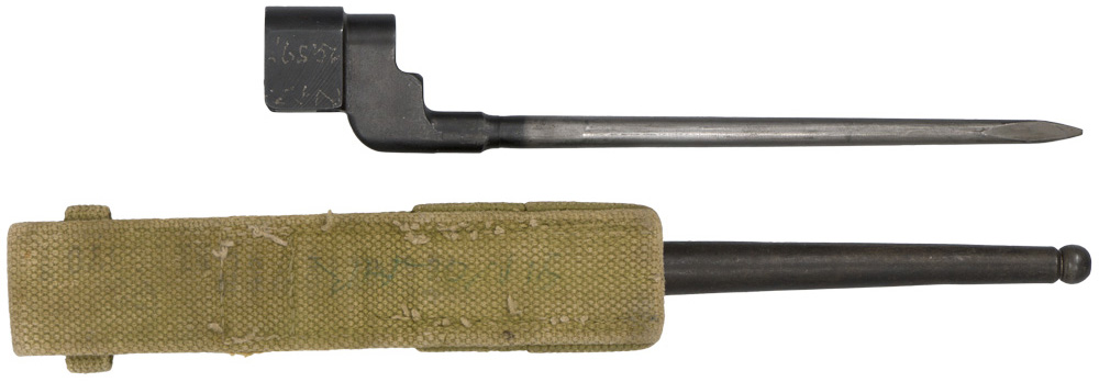 PHYSICAL DESCRIPTION: The bayonet is the form of an 20cm or 8" spike, tapered at its point, which widens and proceeds to one side at its other end where a circular muzzle socket and spring release catch may be seen. The "No 4 MK I" blued metal scabbard is in the form of a tapering tube, 21cm or 8 1/4" long, with a ball tip and a circular frog lug is near its throat. The khaki colored webbed canvas bayonet frog in the form of a vertical strap folded back and stitched upon itself to form a belt loop.