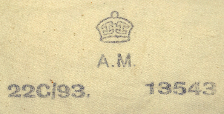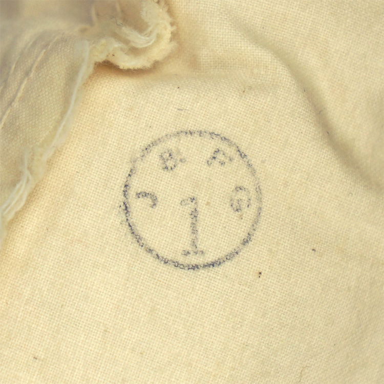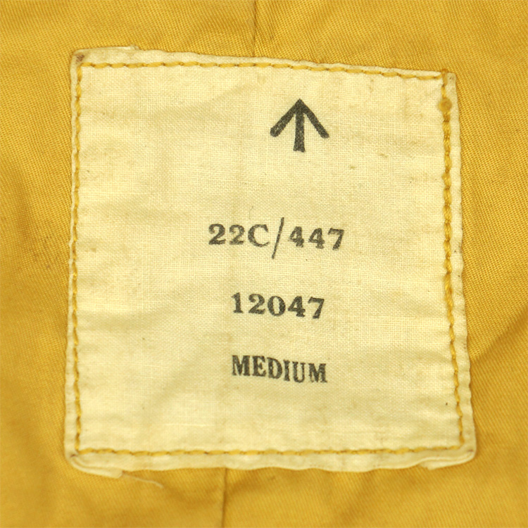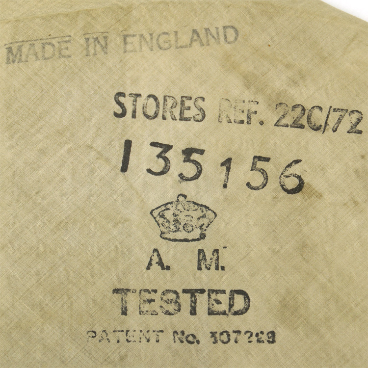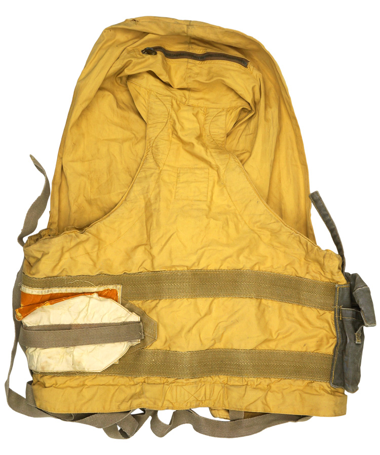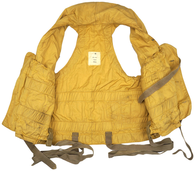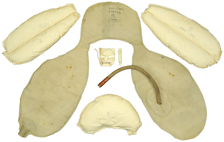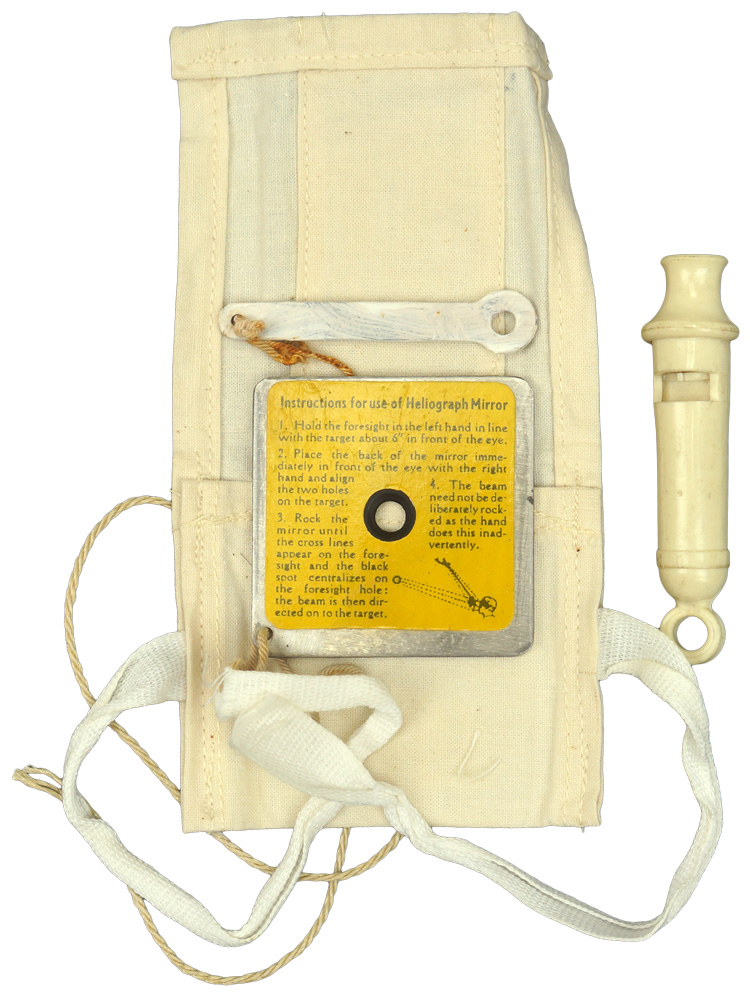 A grouping that consists of the Mae West, waistcoat style life preserver, floatation stole and kapok pads, whistle and mirror. The life preserver has a white cotton tag with a broad arrow, as well as "Medium" and "22C/447, 12047". The pouch for the mirror is marked "Heliograph". All straps are intact. The stole is also clearly marked "Made in England", "Stores Ref. 22C/72, 135156, is Air Ministry marked and tested. The three internal, white cotton kapok pads are stores ref. 22C/93 and are Air Ministry marked as well.