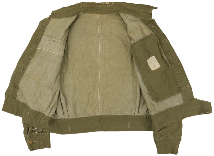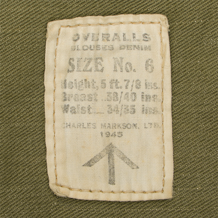 A khaki colour, five shank button front tunic with a pair of hooks and eyelets to the neck opening. A pair of breast pockets with button flaps, integral button shoulder straps and a buckle to the waist completes the tunic. To the unlined interior is a tag which reads " Overalls, Blouses Denim, Size No. 6" along with the Height, Breast, Waist measurements, as well as the manufacture, date of 1945 and a broad arrow. The tunic shows usage and wear.