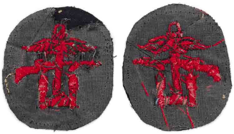 which consists of a "Tommy" gun, an eagle and a stockless anchor, which represents the Army, the Royal Air Force and the Royal Navy, machine embroidered in red on a black felt background. The reverse of the badges have a black cloth backing with glue remnants.