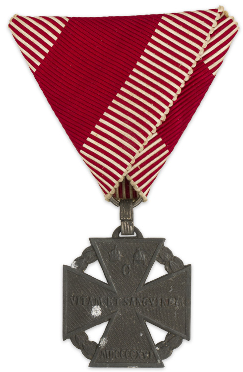 (Medalie)Instituted on December 13, 1916 by Emperor Karl I of Austria/Hungary and awarded for a minimum of twelve weeks of service, regardless of rank, that had served at the front. There were 651,000 awarded. The pateé cross with laurel wreath, is marked to the front with an Austrian and Hungarian crown above the letter "C" (Carolus), along with the words "Vitam Et Sangvinem" (With Life and Blood) and date MDCCCXVI (1916). The opposite side has the words "Grati Princeps et Patria, Carolvs Im. Et. Rex" (A Grateful Prince and Country, Karl, Emperor and King). It is suspended by a ring on an alternate red and white striped silk ribbon. Of Note: This medal’s design is based on the the ‘Cannon Cross’ – ‘Kanonenkreuz’ of 1813-1814.