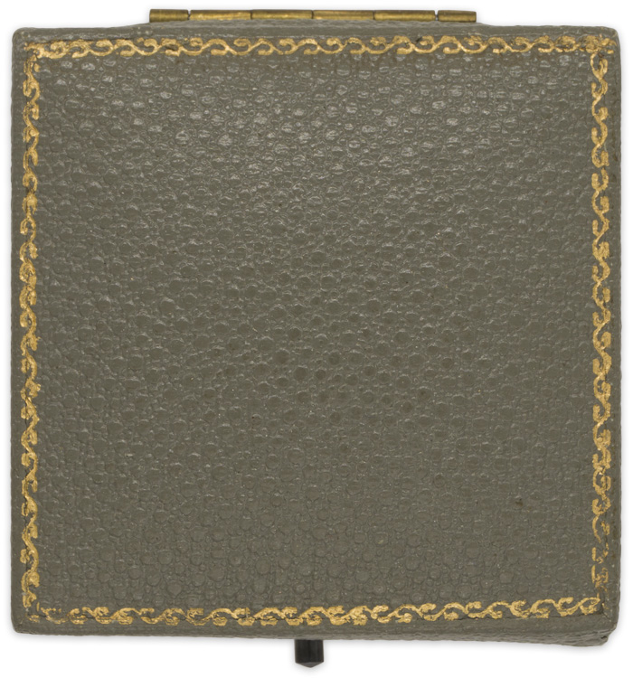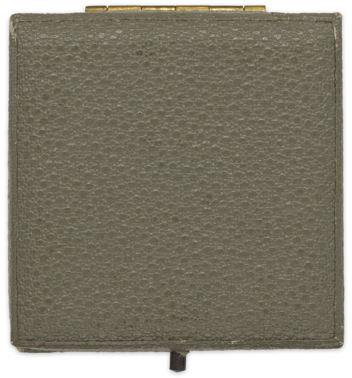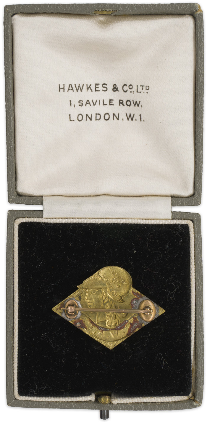 PHYSICAL DESCRIPTION: A 3cm x 2cm badge with hinge pin to the reverse that shows the right facing profile of Athena . The badge is maker marked for "Scully Ltd. Montreal". It comes housed in a "Hawkes & Co. Ltd. London" hinged case that measures approximately 5.5cm x 5.5cm square pebble box.
