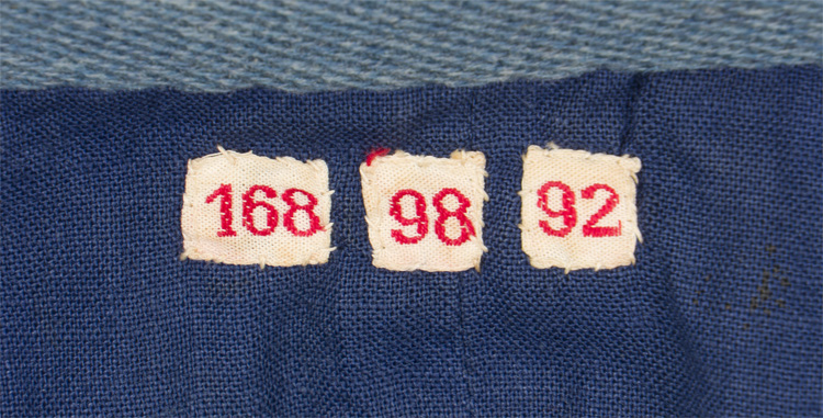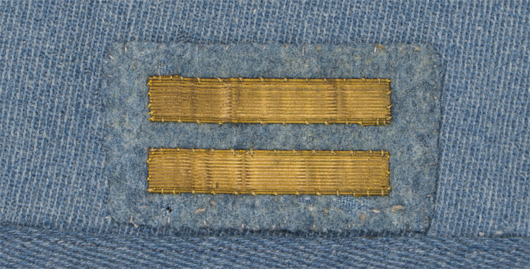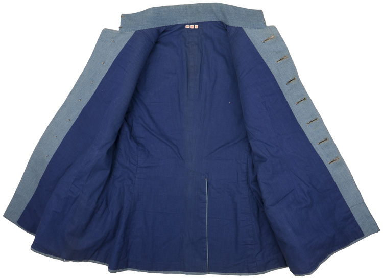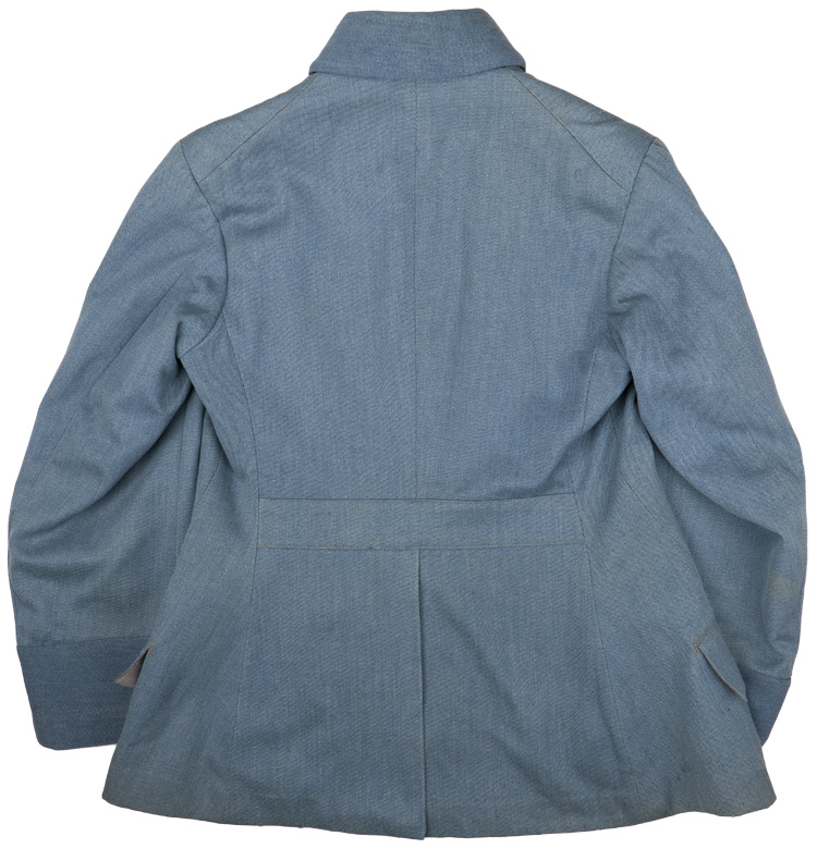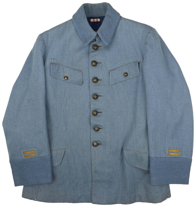 A horizon blue wool tunic with a seven button front that leads to a fold down collar with a pair of hooks and eyelets. A pair of slanted, button pockets are placed high on the chest, while a pair of angled hip pockets with button pockets are to the hips. The left wearing hip pocket has its button missing and has been replaced by a "civilian" button. All other buttons feature a "flaming bomb" design. Above the French cuffs is insignia representing the rank of Lieutenant. The interior is fully lined in an indigo blue cotton. There is some minor moth damage to the front. The chest measures approximately 36".
