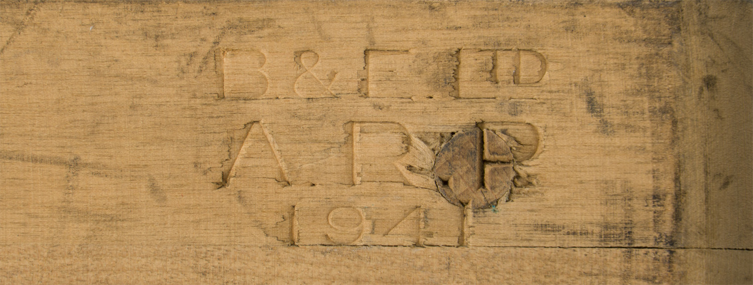 A 27cm long x 10cm wide with an overall length (including handle) of 24cm wooden gas rattle that is embossed to the wood "B.& E. Ltd., A.R.P. 1941". Shows typical wear.