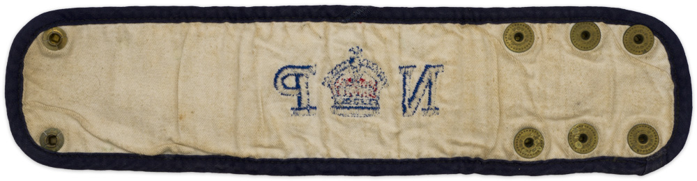 A white wool embroidered and trimmed armband measuring approximately 29cm x 7cm. The strap has three pairs of male snaps and a pair of female snaps for adjustment. Cotton backing present.