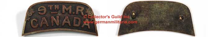 A stamped, copper badge with "9th M.R. Canada" on a pebbled background. Two lugs are present on the flat back, as well as, the maker name "R.J. Inglis Limited." Measures approximately 5cm x 2cm.GRADE *** 3/4 PRICE $30.00