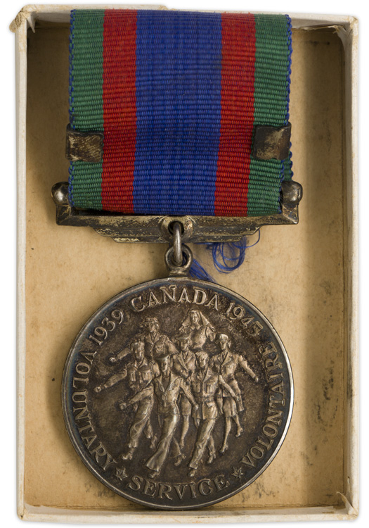 Awarded for eighteen months voluntary war-time service 1939 to 1945. The 37mm diameter silver medal has, to its front, seven marching figures, each representing a man or woman in a branch of service, with "1939 Canada 1945 Voluntary Service Volontaire" scrolled around them. To the reverse is the coat-of-arms of Canada. It is suspended from a 32mm wide green-red-dark blue-red-green ribbon. A silver overseas bar itself has a Maple leaf to its center, indicating at least sixty days service outside of Canada. Also included is the original cardboard issue box with "C.V.S.M." stamped to the top.