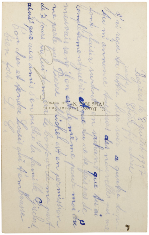 A 8.5cm x 13.5cm, colourized, photograph postcard that has been addressed and written upon.