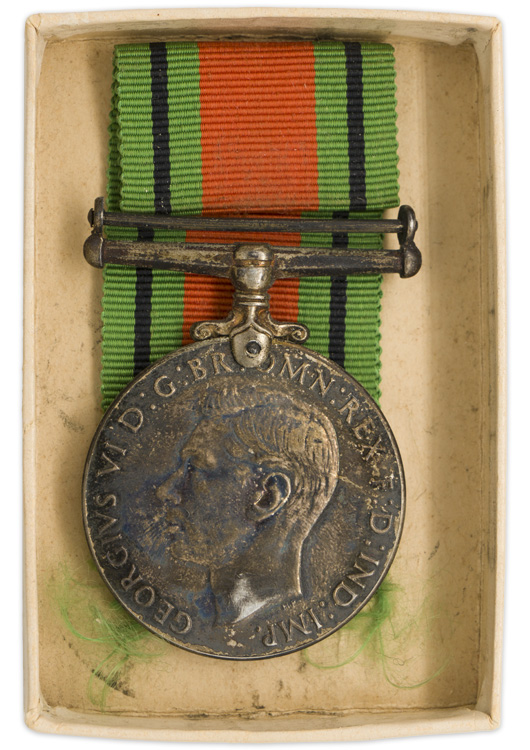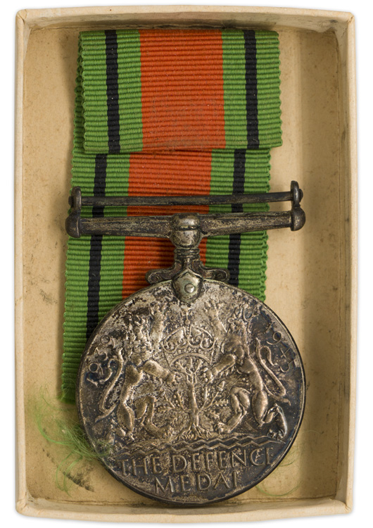 Awarded for three years service in England, between September of 1939 and September of 1945, or one year of service overseas in a non-operational sector, with the colors to the ribbon representing the Blitz. A 37mm diameter, nickel-silver medal, which has riveted to its top the decorative base to a double horizontal bar, for the included ribbon. To the front of the medal is an uncrowned, left facing, profile portrait of George VI, surrounded by the embossed inscription "Georgius VI D: G: Br: Omn: Rex F: D: Ind: Imp:" "HP," no doubt the designer’s initials, may be seen to the base of the bust. To the reverse is a Lion and Lioness to either side of a young oak tree surmounted by a King’s crown, with "1939" to one side, "1945" to the other, and "The Defence Medal" beneath. The medal is suspended from a ribbed ribbon, with a wide, vertical orange stripe to its center, flanked on either side by light green with narrow black stripes. Included is an original, two piece cardboard box with friction top lid that is stamped "Defence Medal".