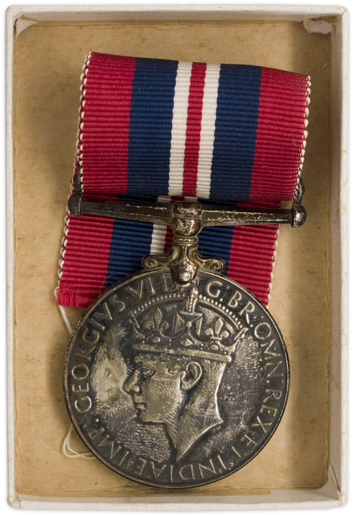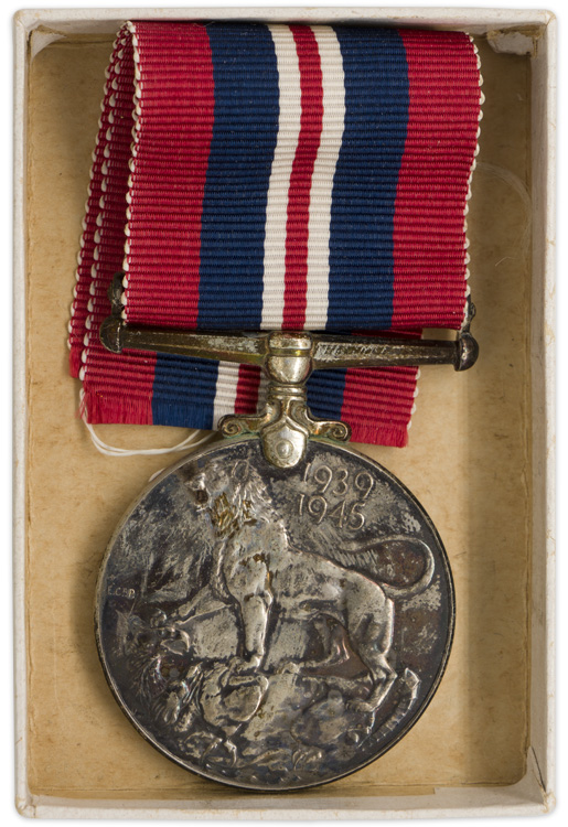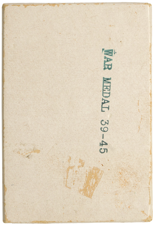 A 3.5cm diameter, silver medal, to whose upper edge is riveted the base of a horizontal bar for its red-dark blue-narrow white-narrow red-narrow white-dark blue-red ribbon. To the obverse of the medal is a crowned, left facing, profile portrait of George VI surrounded by the embossed inscription "Georgius VI D:G:Br:Omn:Rex Et Indiae Imp:" To the reverse are the dates "1939" and "1945" above a Lion standing triumphantly atop a subdued, double eagle-headed beast with claws and a rat’s tail. "E.C.r.P." is embossed to the left of the reverse image, and "P.M." may be seen to the base of the King’s neck to the obverse. Awarded for twenty-eight days’ service in an operational sector. Included is the two piece, cardboard constructed box with friction top. It is stamped to the lid "War Medal 39-45."