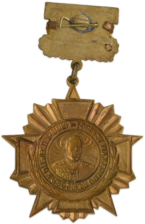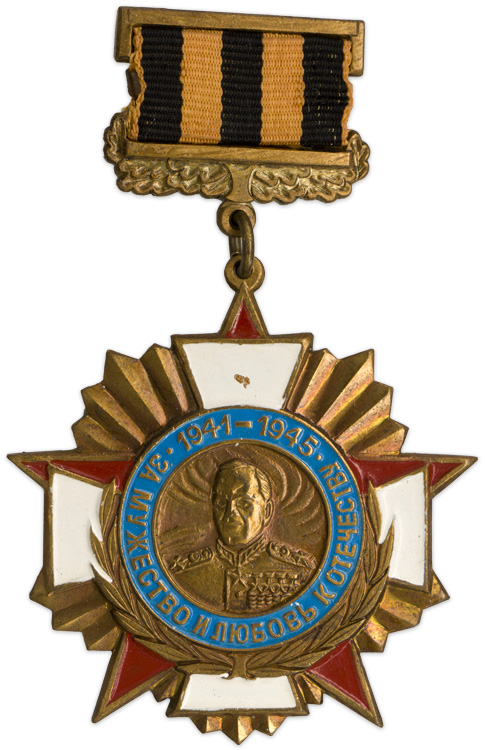 An enamel medal suspended by a George Ribbon. The medal reads "For Courage & Love for the Fatherland" 1941-1945.