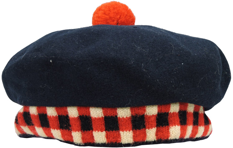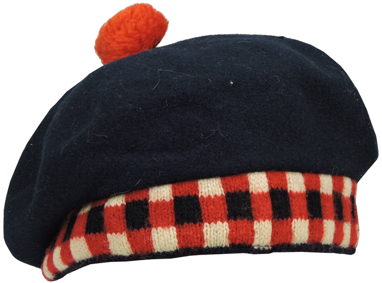 The Balmoral Bonnet, which is known as the Tam o'Shanter, originated in 1915, as a replacement for the Glengarry, to be worn by Scottish troops in combat. A dark blue wool bonnet comprised of a crown with a red coloured wool Touri (pom-pom) to its center and a diced band indicating a "Royal" regiment. Size marked "M" (Medium).