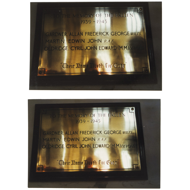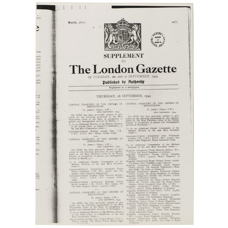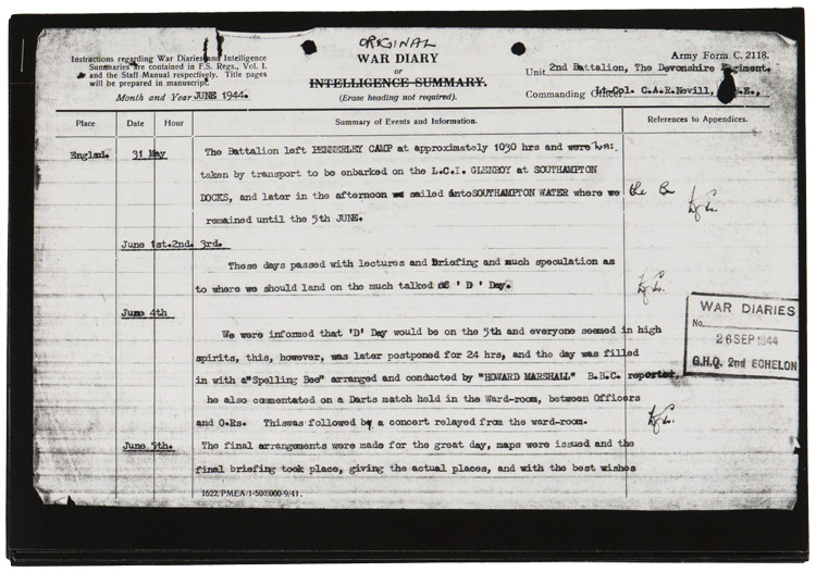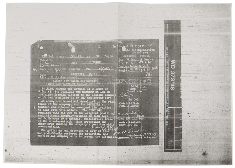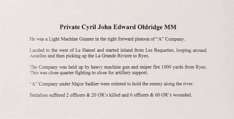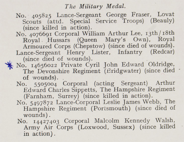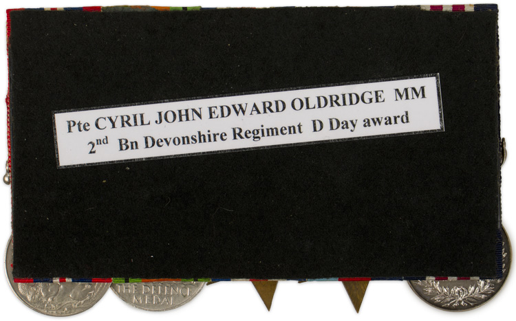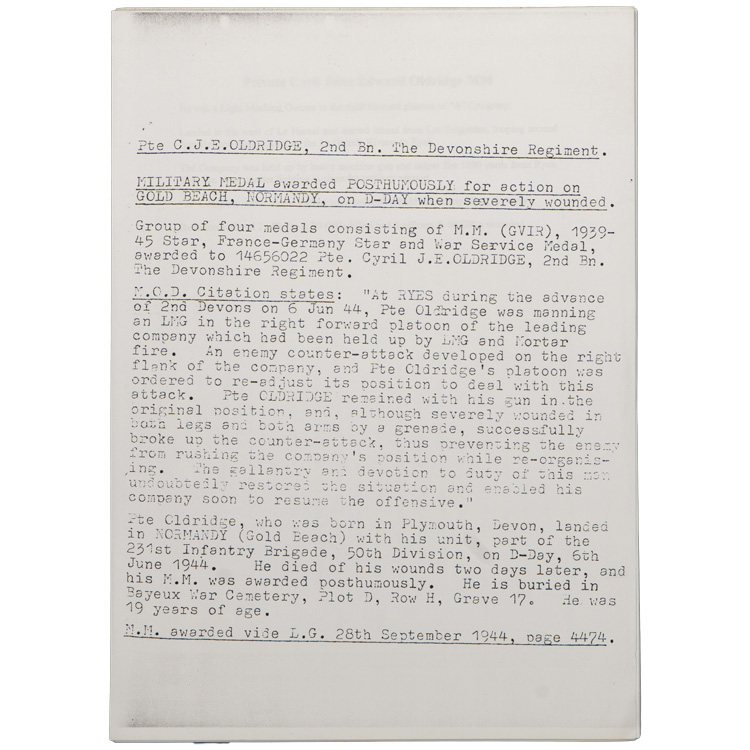 A five place medal bar that was awarded posthumously for action on Gold Beach, Normandy on D-Day where Pte. C.J. Oldridge was severely wounded and later died of his wounds. Also included are various pages of information on Pte. Oldridge, his movements at RYES that lead to being awarded the Military Medal, copies of the War Diary of the 2nd Battalion, the Devonshire Regiment from May 31st to June 10th, 1944 (England to France), photocopy of "The London Gazette" dated for September 28, 1944 with mention of Pte. Oldridge who was awarded The Military Medal, photocopies of maps of "The British Assault Area" along Gold and Juno beaches. Lastly, colour photographs of a plaque within The Parish Church of St. Mary the Virgin, Westonzoyland "To the Memory of the Fallen" where Pte. Oldridge is mentioned. The medals are modern mounted and are from left to right The Military Medal, 1939-1945 Star, France-Germany Star, 1939-1945 Defense Medal and the 1939-1945 War Medal.