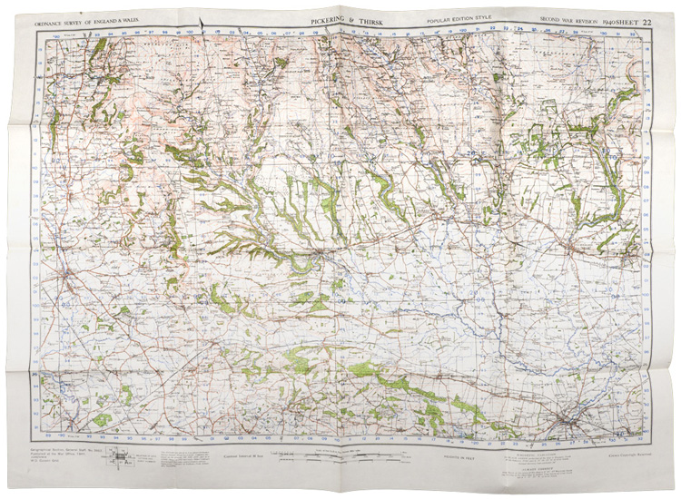 A 75cm x 55cm single sided map titled "Ordnance Survey of Pickering & Wales, Second War Revision 1940, Sheet 22". Dated 1941. The map has heavy fold lines due to storage. The map measures approximately 14cm x 19cm when folded.