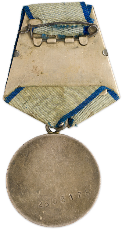 This medal was awarded for bravery on the field of battle. Complete medal loop with parade mount ribbon with pin back device. Ribbon colors are blue/silver/blue. The detail of the image of the tank and planes and the lettering is sharp and well defined. The pin-back mechanism is in working order. Reverse is engraved "2508178". The number of this medal indicates it was issued during World War II. After 1947 the Medal for Valor was unnumbered.