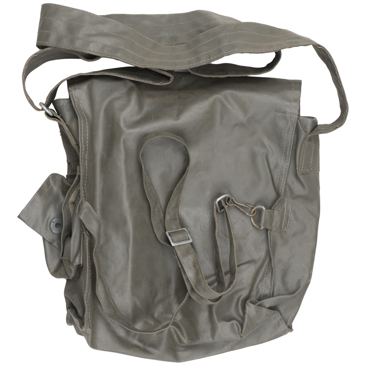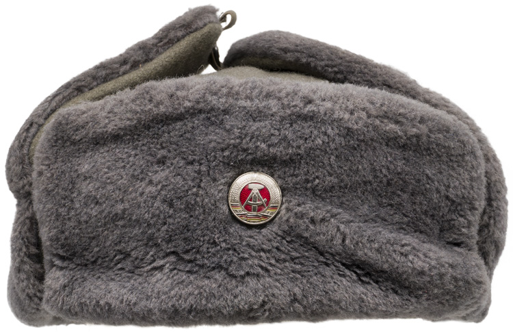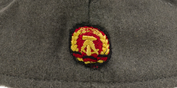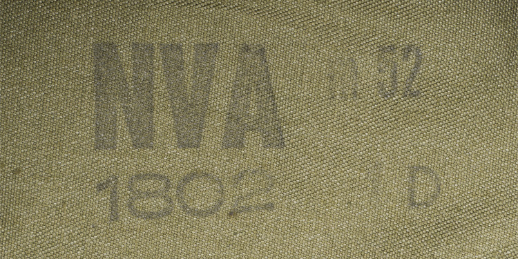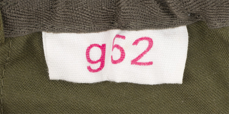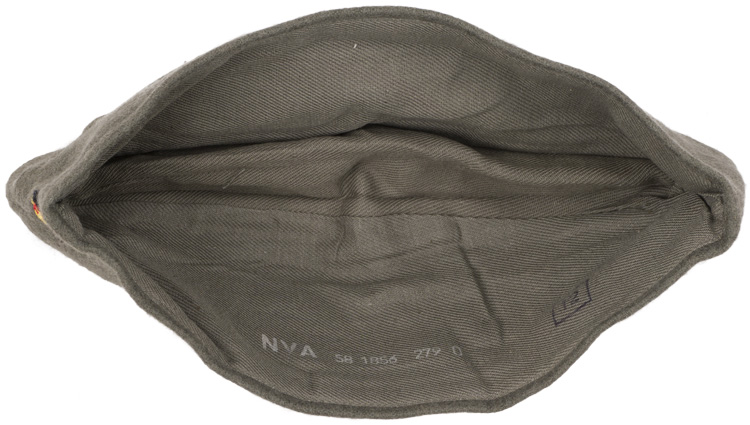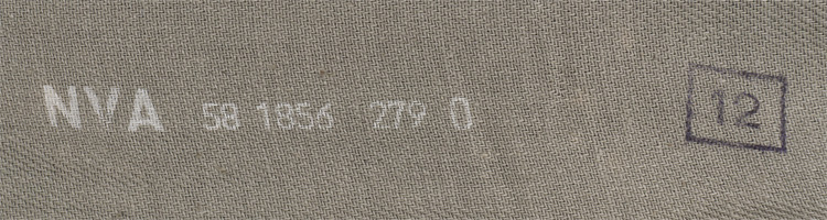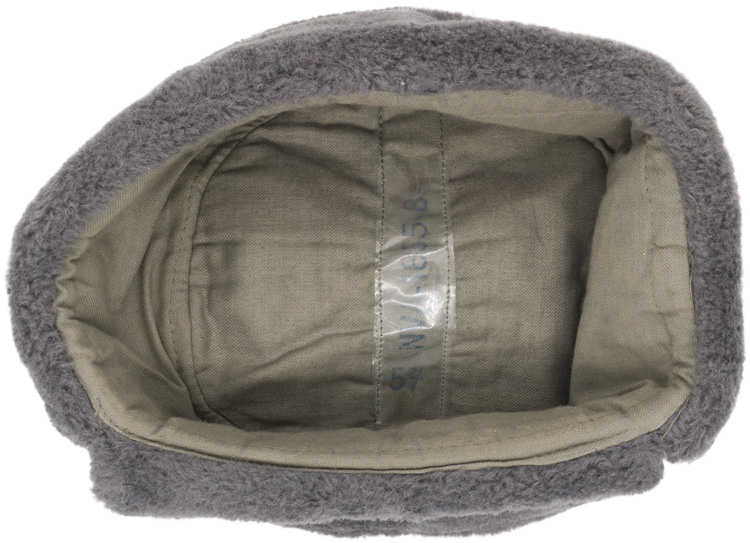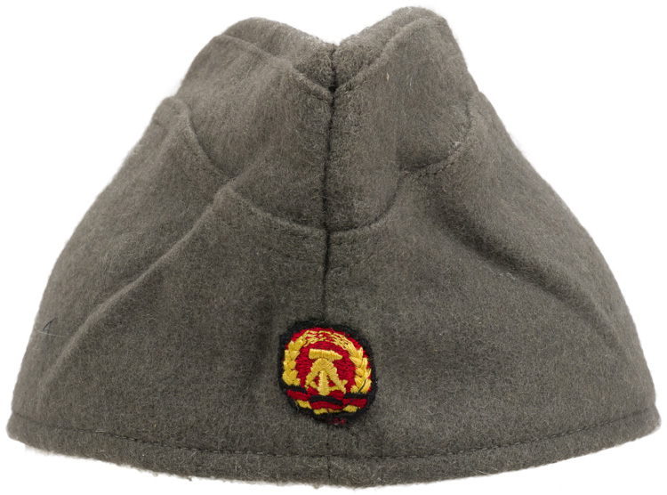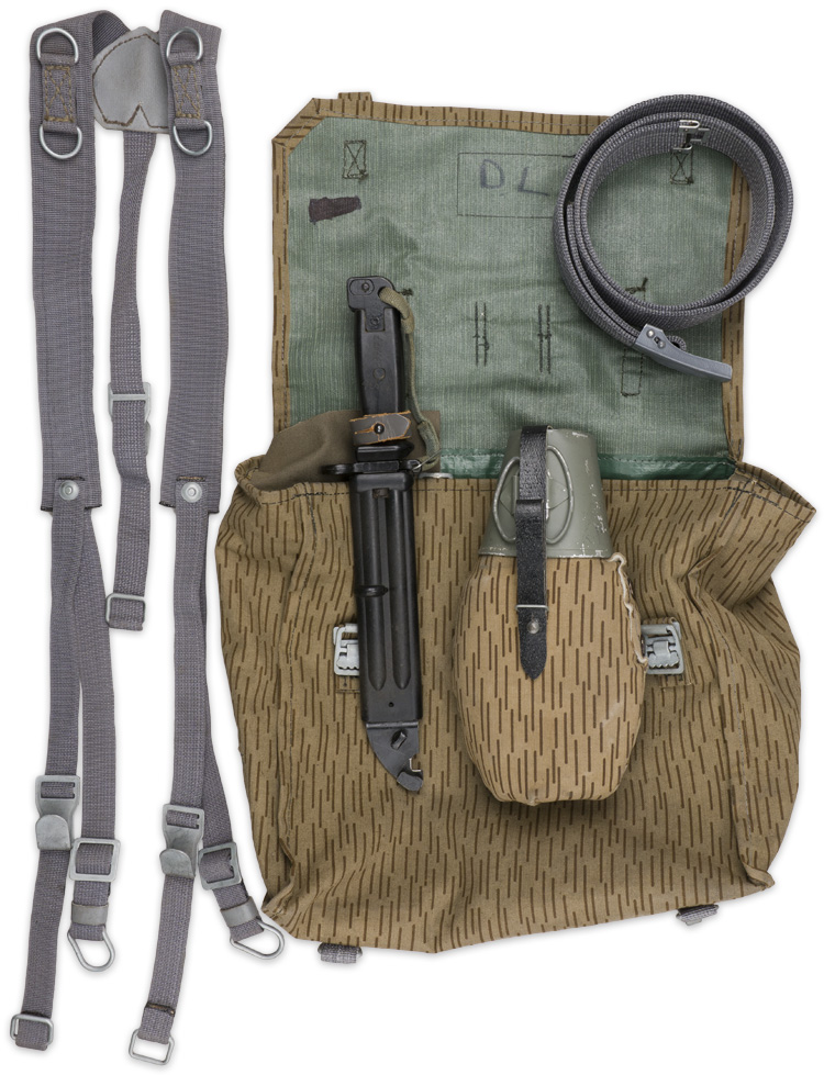 This grouping consists of a East German Model M56/66 combat helmet with camo cover that has a face veil and neck cover. It is approximately a size 56. Other items include a overseas cap with is stamped "NVA" and a size 12 marking, a NCO fur hat that is marked size 57, a tunic with collar that has a 44" chest and a tag to the interior that reads"M42", a pair of matching trousers with suspenders that have a 34" waist and a 32" breech with a tag to the interior of the trousers reads "G52". A pair of black boots that are marked for size 27 and a pair of winter splinter mitts that are marked size 3. . There are also numerous pieces of field gear that includes an entrenching tool with cover (the shovel was made for the NVA and for export to other Communist countries that has a "Made in GDR" stamped on the blade. The blade also has a nail puller and a saw blade to one side. There is also an ammo pouch which is curved to fit early AK 47 magazines, a belt, canteen, set of "Y" straps, a combat pack, gas mask bag and a combat pack. The last item is an Armoured Drivers badge with a simple hinge pin.