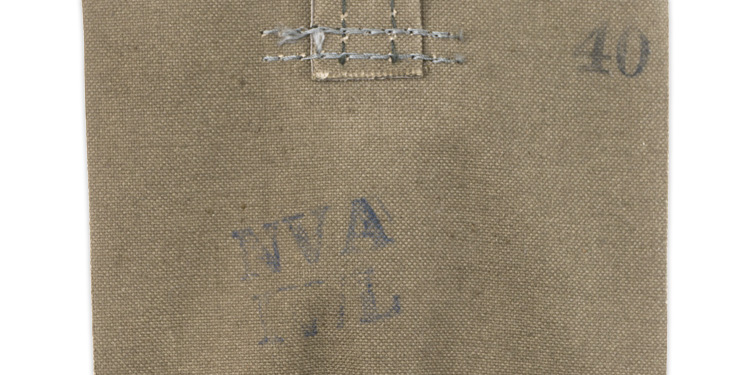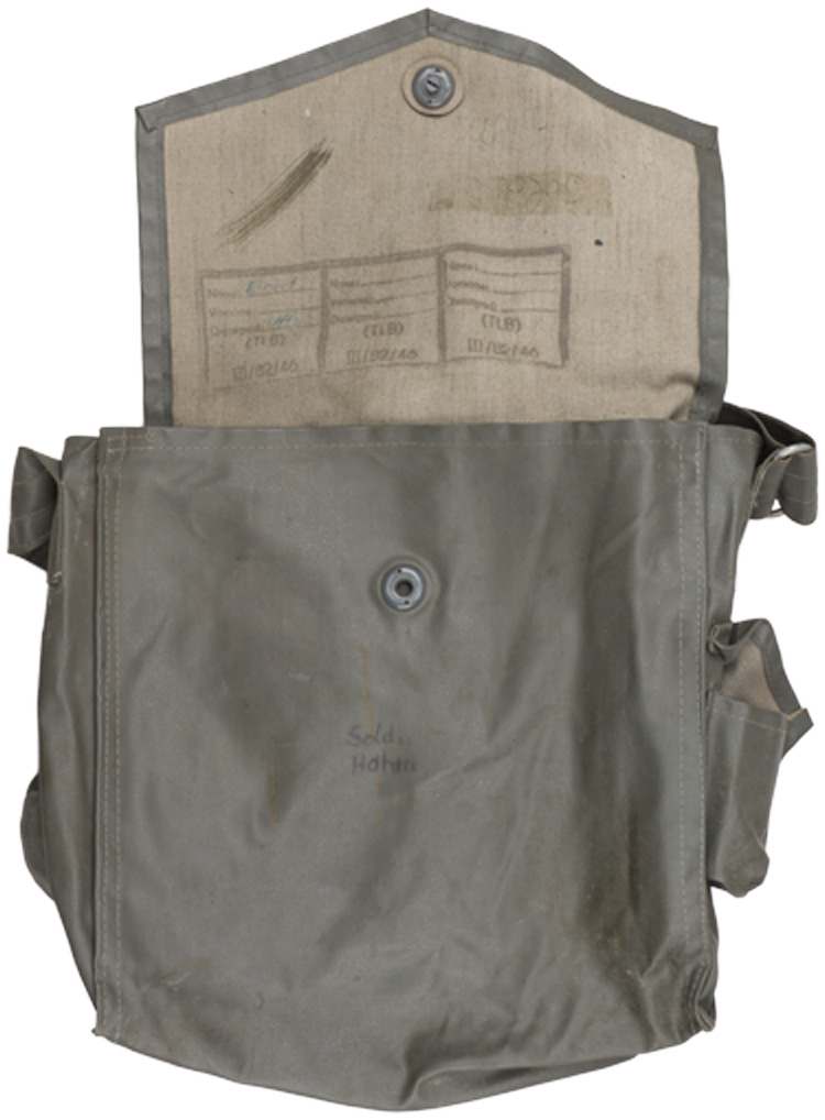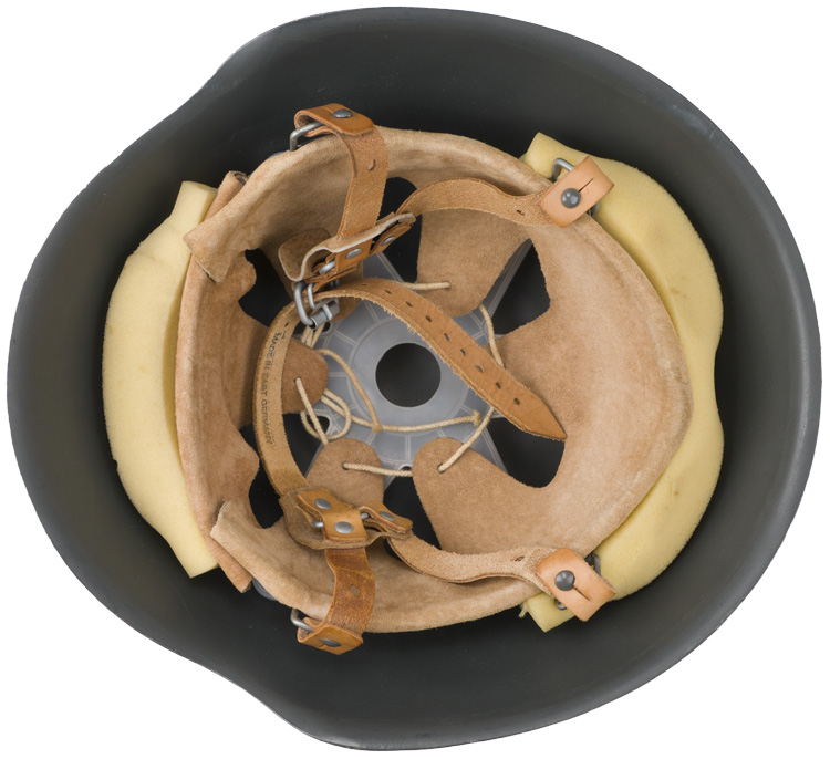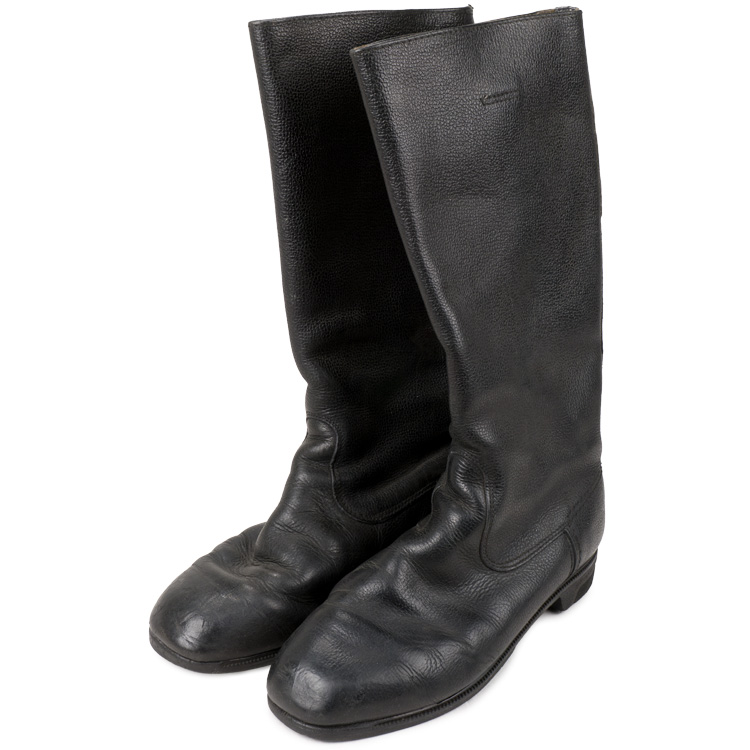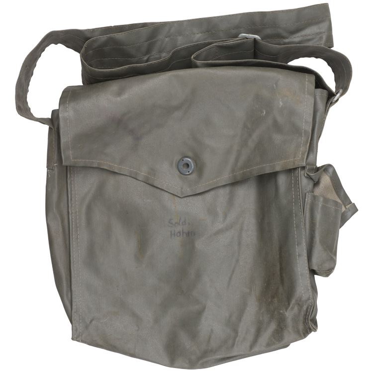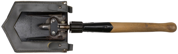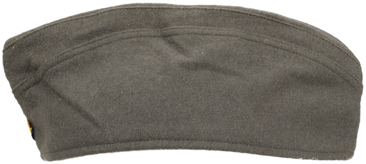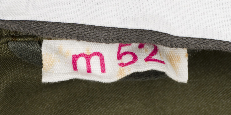 This grouping consists of a East German Model M56/66 combat helmet with camo cover that has a face veil and neck cover. It is approximately a size 56. Other items include a overseas cap with is stamped "NVA" and a size 12 marking, a NCO fur hat that is marked size 57, a tunic with collar that has a 44" chest and a tag to the interior that reads"M42", a pair of matching trousers with suspenders that have a 34" waist and a 32" breech with a tag to the interior of the trousers reads "G52". A pair of black boots that are marked for size 27 and a pair of winter splinter mitts that are marked size 3. . There are also numerous pieces of field gear that includes an entrenching tool with cover (the shovel was made for the NVA and for export to other Communist countries that has a "Made in GDR" stamped on the blade. The blade also has a nail puller and a saw blade to one side. There is also an ammo pouch which is curved to fit early AK 47 magazines, a belt, canteen, set of "Y" straps, a combat pack, gas mask bag and a combat pack. The last item is an Armoured Drivers badge with a simple hinge pin.