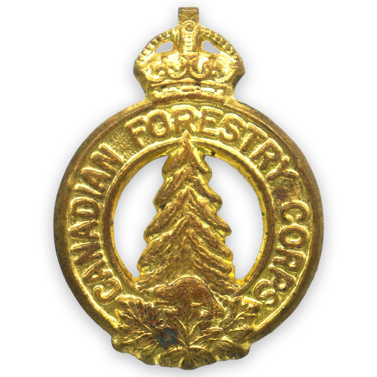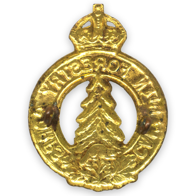 : Originally formed in 1916, the corps was made up from the 224th Forestry Battalion and other infantry battalions whose responsibility was to clear airfields, preparing railroad ties, and providing lumber to be used in the construction of trenches, barracks, hospitals, etc. They were disbanded in 1920 to be reformed in 1940 and sent to Scotland. The Newfoundland Overseas Forestry Unit (1939-1946) wormed in 35 camps in Scotland and Northern England for the duration of the war when they were once again disbanded in 1946.PHYSICAL DESCRIPTION: A stamped, gilt alloy badge measuring approximately 5cm x 4cm made up of a circle inscribed with "Canadian Forestry Corps" with a surmounted King’s Crown with a profile of a beaver atop a small grouping of maple leafs to the bottom. A tree is central to the design. The reverse is a mirror image of the front with two lugs present.