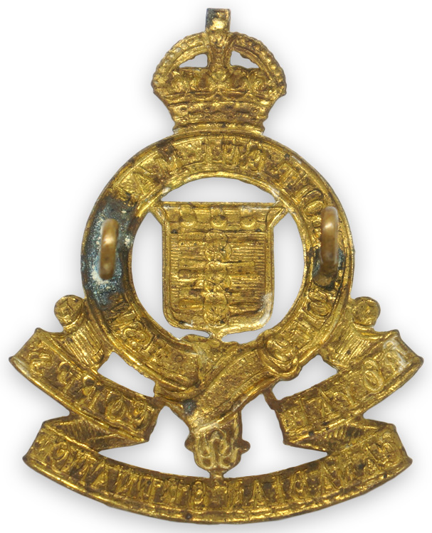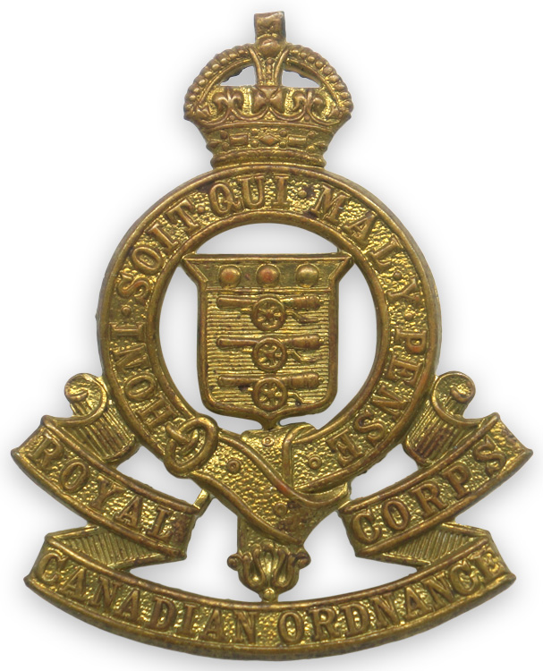 PHYSICAL DESCRIPTION: A stamped, gilt alloy badge consisting of a shield with three vertical cannons surrounded by a garter with "Honi Soit Qui Mal Y Pense" (Evil To Him That Evil Thinks) embossed upon it surmounted by a King's crown all resting on a scroll with the inscription "Royal Canadian Army Ordinance Corp." Two lugs are present to the mirror reverse.