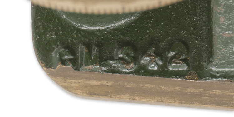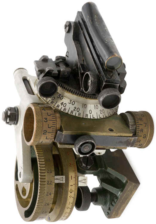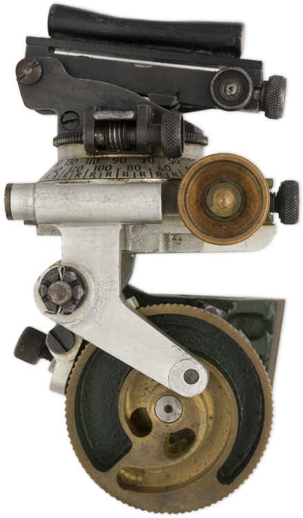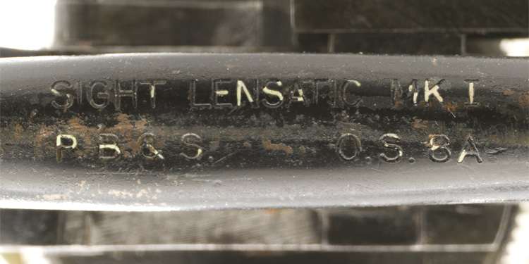 A site dial for the Vicker’s machine gun that is marked to the top "Site Lensatic Mk. I, P.B. & S. O.S. 8A". The top most bar has a concave bend.