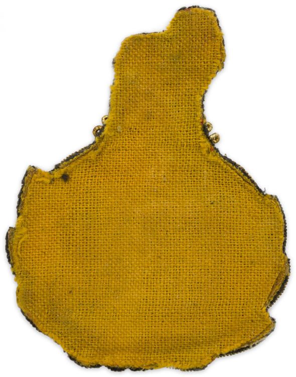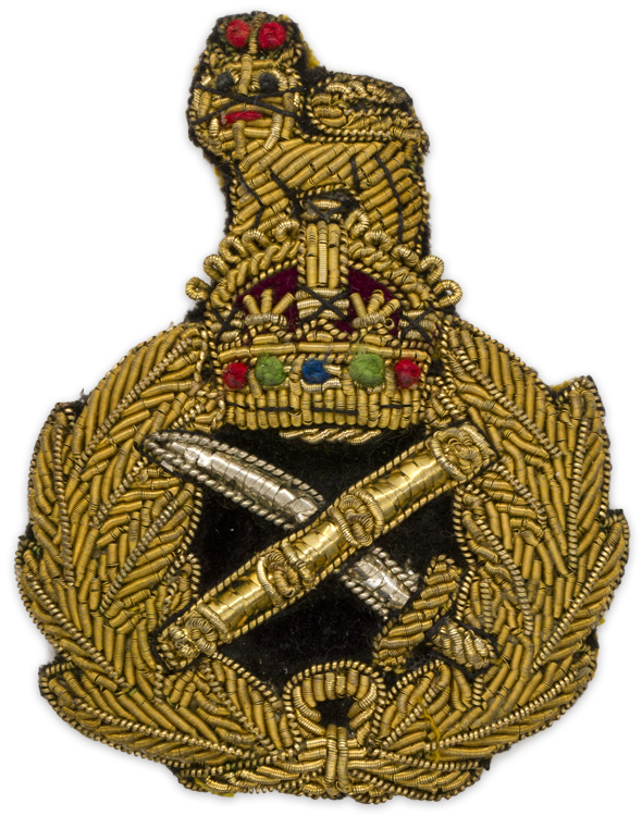 A padded and bullion formed cap badge measuring approximately 5cm x 6cm featuring a lion atop a Kings Crown with crossed saber and cannon to the center surrounded by laurel wreath.