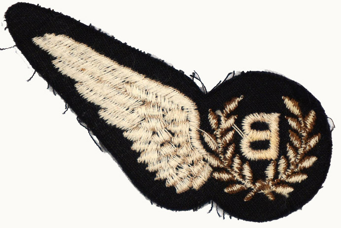 A machine-embroidered breast insignia in the form of a silvery-white wing extending to the upper facing right from a copper-brown colored wreath of laurels and "B" to its center, again in silvery-white.