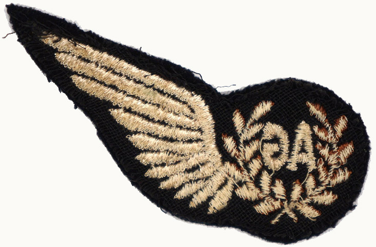 A machine-embroidered breast insignia in the form of a silvery-white wing extending to the upper facing right from a copper-brown colored wreath of laurels and "AG" to its center, again in silvery-white. The original backing in place and some light fraying. A nice example.