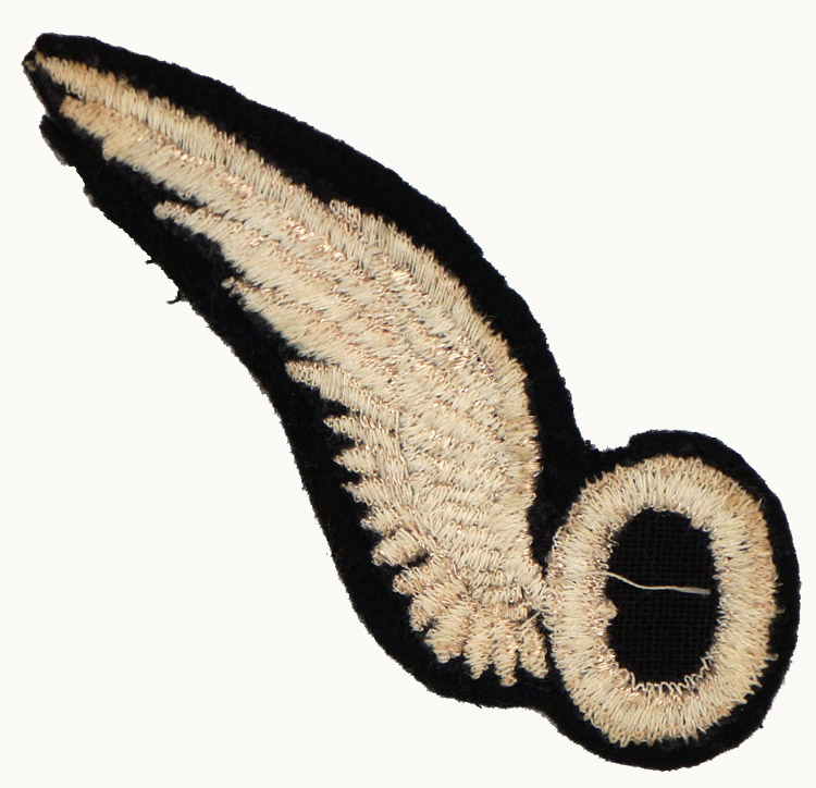 A machine-embroidered breast insignia in the form of a silvery-white wing extending to the upper facing right from a large oval letter "O" to its center, again in silvery-white.