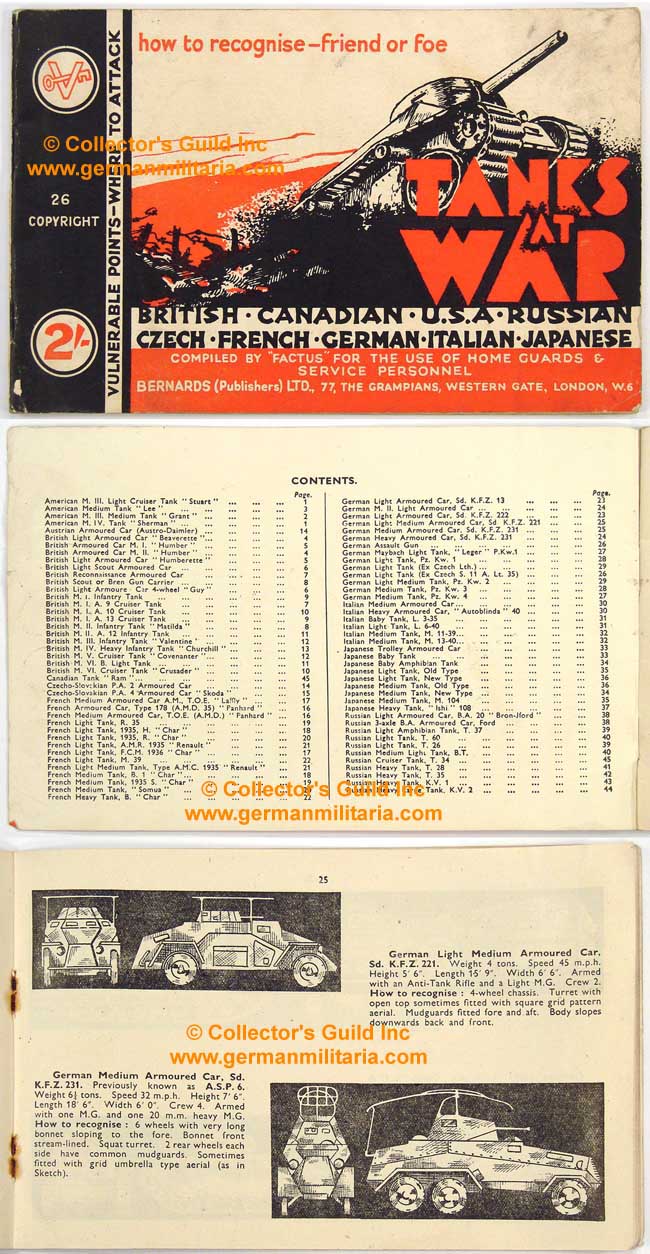 . This 18cm x 11.5cm pamphlet, made with mid-weight card stock, was "compiled by "Factus" for the use of home guards and service personnel" and published in London by Bernards Publishers Ltd. It consists of 48 pages with black and white sketches of tanks with side and front views. On the back cover is "Key Drawing to Tank Parts." which is very detailed and well done. Nice example.GRADE **** PRICE $48.00