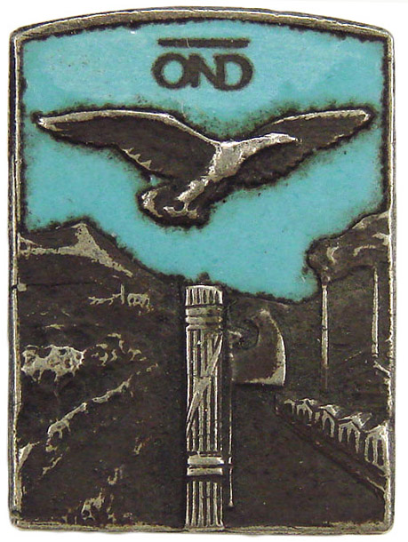 : The "Opera Nazionale Dopolavoro" or "Leisure and Recreational Organization" was originally formed in 1925 under the demands of the Fascists unions as a way to compete with the Socialists who had a network of cultural organizations. Originally, it was not affiliated with the Fascist Party and therefore gained support of employers, and was modeled after the YMCA. This changed in 1927 when it was taken over by Augusto Turati who turned the O.N.D. into an auxiliary of the party. In 1930, under Archelle Starace, the O.N.D. became primarily a Sports & Recreational organization of sports and other outings.PHYSICAL DESCRIPTION: A silver alloy , and enamel square shaped, lapel or button hole pin that has a silver frieze on a blue enamel sky (background) with a stylized "OND" to the top. The makers mark is to the reverse. The metal shows darkening, but otherwise, is in nice condition.