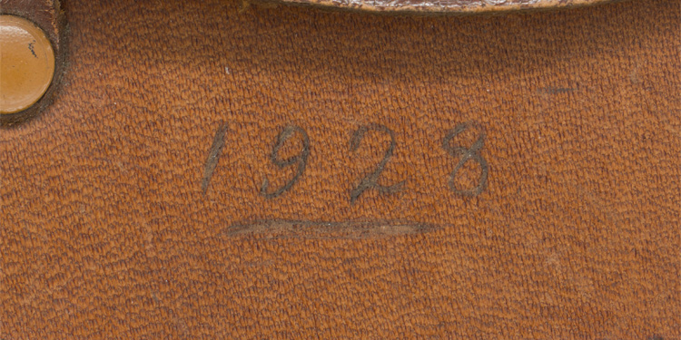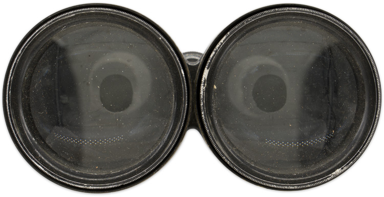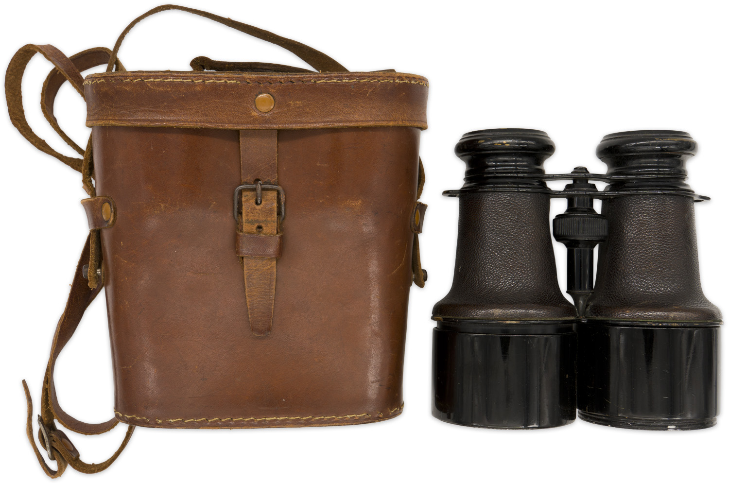 A pair of leather covered, blackened alloy binoculars in their original leather case. The leather, kidney shaped case has single strap, reinforced stitched to the front of the lid that corresponds to the single prong buckle to the front. A matching leather strap is included. The interior houses a pair of dark brown, pebble leather and blackened alloy binoculars that have, between the tubes, a serrated wheel that allows the eyepieces to be raised or lowered to focus. The eyepiece barrels or tubes read "Nautique" with a fouled anchor and "Marque IRIS de Paris". The optics are clear and strong. The case measures approximately 14.5cm tall, x 13cm wide. Someone has handwritten the year "1928" to the top of the lid. Beautiful set of binoculars!!