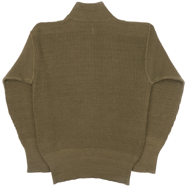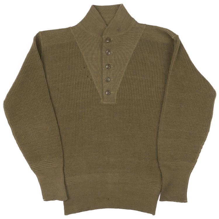 Developed in 1942, this sweater was produced throughout the war. This high neck example is a darker shade of O.D. wool that appeared in 1944 with the advent of the new M43 field uniform. The chest measures approximately 36" with a sleeve of 23.5" long. The ribbing at the cuffs retains its form. There are some small holes and snags to the material.