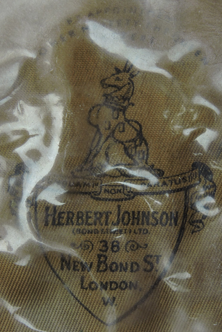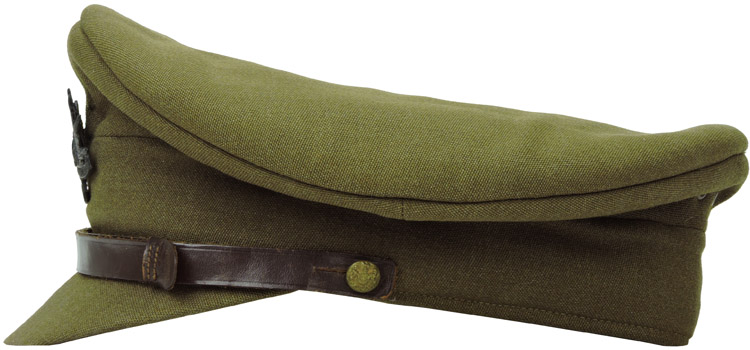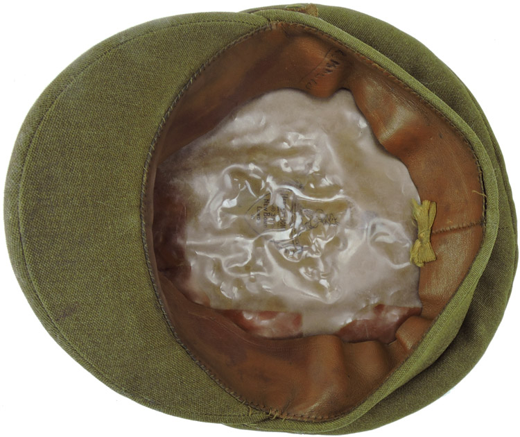 Olive drab wool body, center band, and visor. Australian Commonwealth Military Forces cap badge affixed to the front. Adjustable brown leather chinstrap affixed by brass buttons. Four olive drab painted brass grommet ventilation holes are under the rear crown. London makers logo & info. Complete liner, celluloid sweat shield and wide leather sweatband. Roughly a size 57. Nice worn and used example showing the expected age and wear.