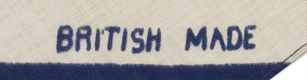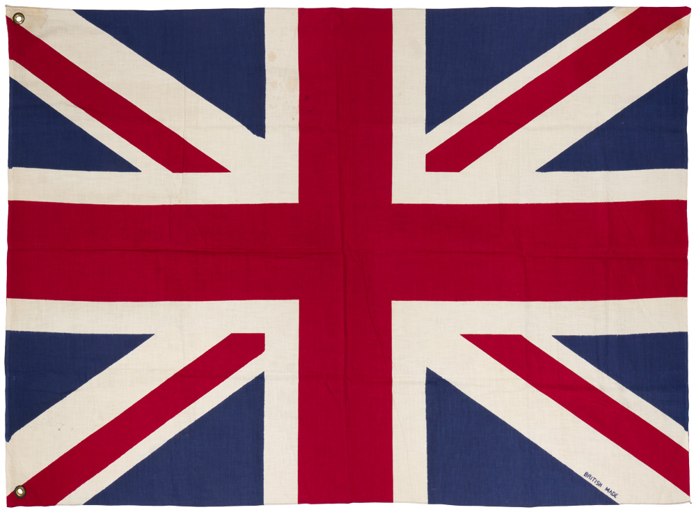 A printed, double sided, 84cm x 116cm, "British Made" cotton. The blue background with the white diagonals represent Scotland and Saint Andrew’s cross. The red diagonal is symbolic for Ireland Saint Patrick’s cross, while the Red diagonals on white, they represent England and Saint George’s cross. A brass grommet is to each end of the shorter end for suspension.