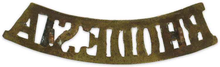 WW2 Rhodesia National Shoulder Strap Title in Brass. Curved brass "Rhodesia" rocker as worn on the shoulder straps or as a shoulder title. Two loops on the reverse for affixing to the shoulder strap with a cotter pin. Excellent condition, scarce.