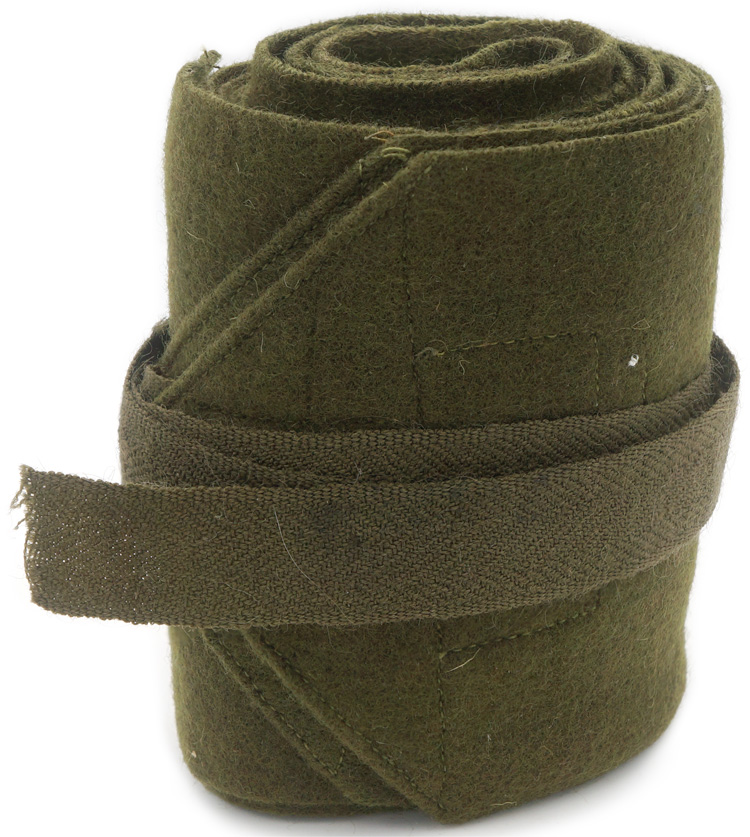 A pair of wool puttees that have a cotton label attached that has to it "Made in Australia" and a 1943 date. The puttees measure approximately 11.5cm x 104cm long. Wool is in very nice condition.