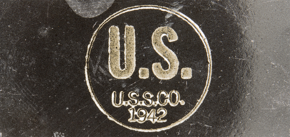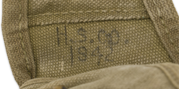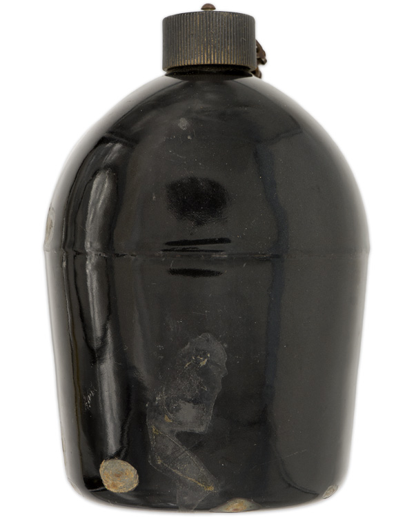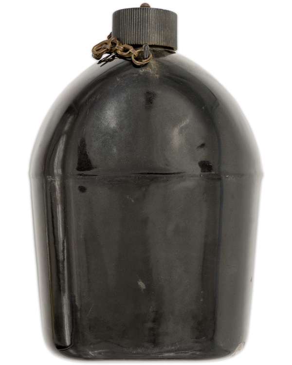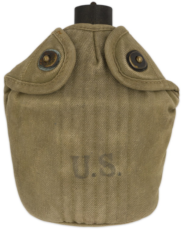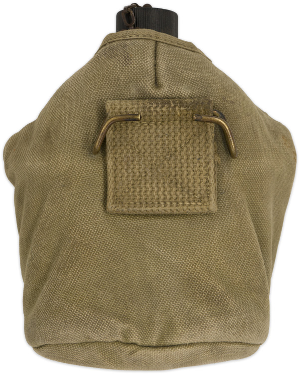 A one quart capacity black enamel steel canteen with a slight concave to its reverse and retains its black "Bakelite" screw cap, attached between its top and a flange brazed to the base of the neck by a metal chain. A brazing line may be seen running horizontally to the canteen. Bottom is well marked "U.S., U.S.S. Co. 1942". Included is an aluminum cup with spring steel handle that is marked "G.M.CO 1945". Its Khaki canvas cover has felt padding to its interior and two extended flaps to its open top, each of which have a lift-the -dot snap which mates with a corresponding stud to the upper body of the cover. The snaps and studs are of blackened brass. There are seven vertical reinforcing stitching lines to the front with "U.S." in black ink stamped beneath the stitching. The vertical webbed canvas loop sewn to the reverse has a top and bottom vertical reinforced strap, as well as a horizontal brass belt hook fed through it. Visible to the interior of one of the flaps is "H.S. Co. 1942." The M-1941 cover is faded.