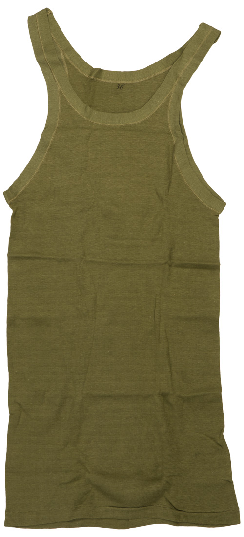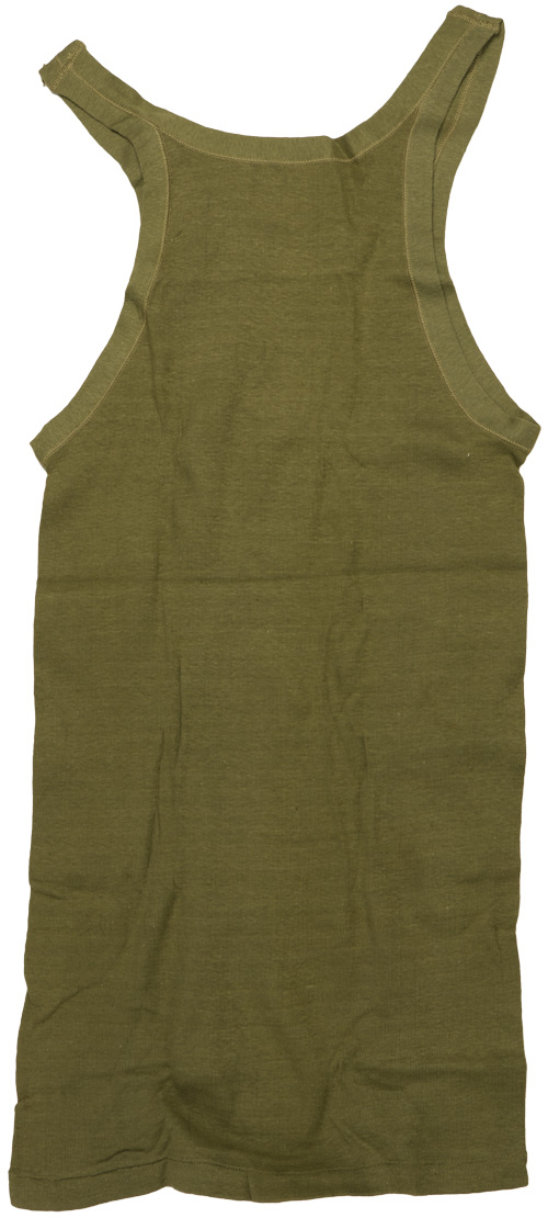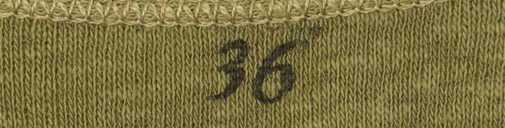 A khaki/olive drab, cotton, sleeveless undergarment to be worn under the shirt. It is stamped as a size "36", manufactured by the "Utica Knitting Co.", dated "Sept. 13, 1944" and distributed though the "Philadelphia Q.M. Depot." "36" is also stamped in black ink on the inside neck. Nice example.