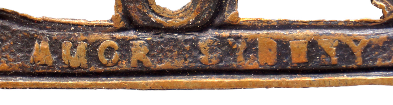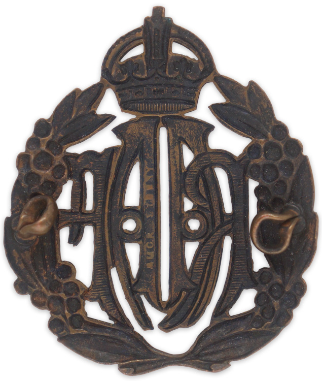 PHYSICAL DESCRIPTION: A stamped, blackened brass cap badge measuring approximately 4cm x 4.5cm with two lugs to the reverse that is a mirror image of the front. Manufacture markings to the reverse. The lugs have been flattened.