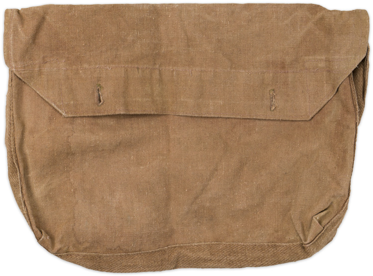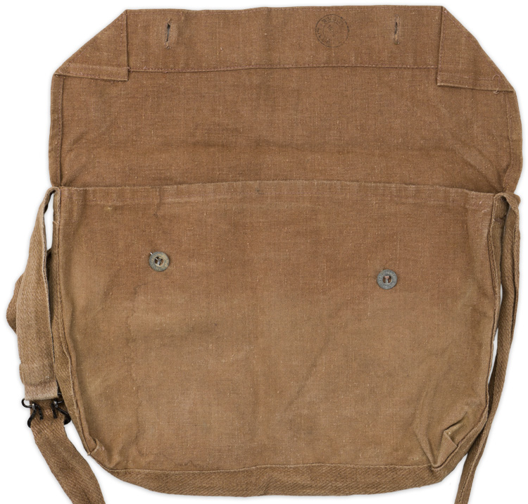 A coarse cotton bag with strap, has a double button flap that covers the single pouch interior. The bag measures approximately 35cm x 26cm x 3cm. The metal dish buttons to the front are marked "Equipements Militares." One button is attached via a safety pin. A small ink marking is under the flap. The bag shows usage and wear.