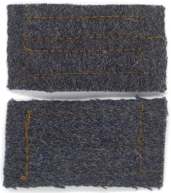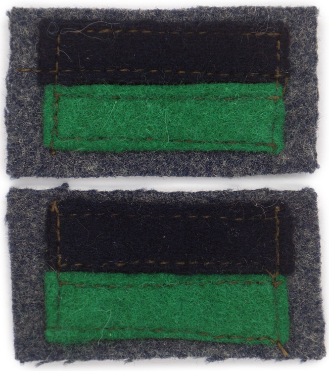 A pair of unit patches showing a black bar atop a dark green on a grey wool backing. The badges measure approximately 5cm x 3cm. Unissued.